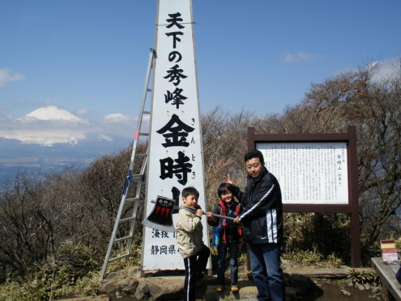 登頂の記念撮影スポットには「天下の秀峰 金時山」の看板と金太郎の鉞(まさかり)の